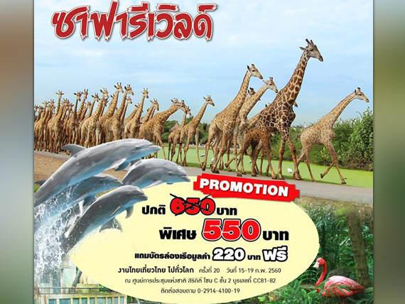 ซึ่งในตอนนี้ ซาฟารีเวิลด์ ได้จัดโปรโมชั่นใหม่เอาใจเด็ก ๆ กับราคาสุดพิเศษ เฉพาะ ในงานไทยเที่ยวไทย ไปทั่วโลก ครั้งที่20 จากปกติราคา 650 บาท แต่พิเศษสุด ๆ ลดเหลือ 550 บาทเท่านั้น แถมบัตรล่องเรือมูลค่า 220 บาท ฟรี!!! สามารถไปจับจองส่วนลดนี้ได้ที่