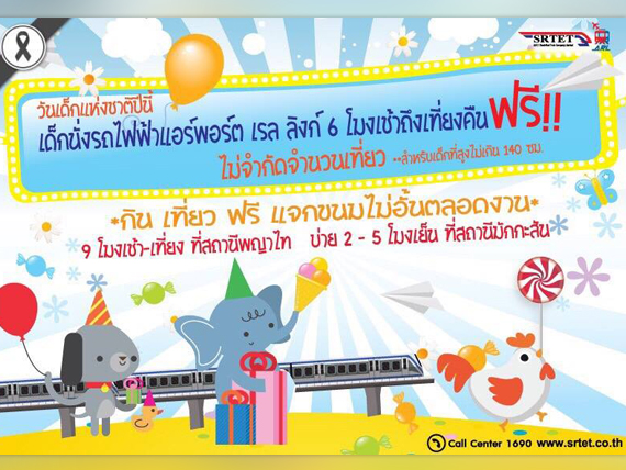 วันที่ 9 ม.ค. 60 นายประเสริฐ อัตตะนันทน์ กรรมการและรักษาการกรรมการผู้อำนวยการใหญ่บริษัท รถไฟฟ้า ร.ฟ.ท. จำกัด หรือผู้ให้บริการรถไฟฟ้าแอร์พอร์ต เรล ลิงก์ เปิดเผยว่า เพื่อเป็นการมอบของขวัญให้แก่เด็กในวันเด็กแห่งชาติ บริษัทฯ จึงให้เด็กที่มีความสูงไม่เกิน 140 เซนติเมตร ใช้บริการฟรี ในวันเสาร์ที่ 14 มกราคม 2560 ตลอดเวลาให้บริการ ตั้งแต่เวลา 06.00–24.00 น. พร้อมทั้งจัดคาราวาน ตัวแมสคอตแอร์พอร์ต เรล ลิงก์ และตัวการ์ตูน แจกของขวัญ รวมทั้งขนมให้แก่เด็กที่รถไฟฟ้าแอร์พอร์ต เรล ลิงก์ สถานีพญาไท เวลา 09.00–12.00 น. และที่สถานีมักกะสัน เวลา 14.00–17.00 น.