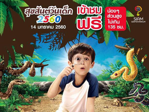 ซึ่งวันที่ 14 มกราคม 2560 วันเด็กแห่งชาติ ทางสยาม เซอร์เพนทาเรียม ศูนย์การเรียนรู้และพิพิธภัณฑ์งูรูปแบบ interactive ได้จัดกิจกรรมพิเศษรับวันเด็กแห่งชาติ มอบความสุขให้กับเด็กๆ ที่มีส่วนสูงไม่เกิน 135 ซม. เข้าชมฟรี ไม่เสียค่าใช้จ่าย โดยน้องๆจะได้เรียนรู้เรื่องชีวิตของงู และยังได้กิจกรรมร่วมระบายสีสร้างสรรค์จินตนาการ พร้อมรับของที่ระลึกมากมาย โดยจะเปิดให้เข้าชมตั้งแต่เวลา 09.00 - 15.00 น. ณ สยาม เซอร์เพนทาเรียมถ.ลาดกระบัง กรุงเทพฯ