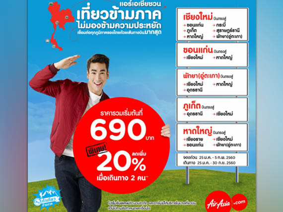วันนี้ govivigo มีโปรโมชั่นใหม่จากสายการบิน AirAsia กับโปร "AirAsia ชวนเที่ยวข้ามภาค กับราคาตั๋วสุดคุ้ม 690 บาท" กับเส้นทางการบินในประเทศ อาทิเช่น เชียงใหม่, เชียงราย, ขอนแก่น, ภูเก็ต, หาดใหญ่, กระบี่, สุราษฎร์ธานี, อุดรธานี, อุบลราชธานี และอีกหลายเส้นทาง ในราคาเริ่มต้นเพียง 690 บาท และพิเศษสุด ๆ ส่วนลด 20% เมื่อเดินทาง 2 คน ราคาถูกสุด ๆ จนต้องรีบจอง!!!