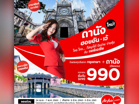 เพื่อน ๆ คนไหนที่กำลังวางแพลนเที่ยวเวียดนามอยู่ในช่วงนี้ govivigo ขอแนะนำโปรโมชั่นใหม่จากสายการบิน AirAsia "AirAsia ชวนเที่ยวดานัง บินง่าย จ่ายคุ้ม ในราคาตั๋ว 990 บาท" เส้นทางการบินต่างประเทศ จากกรุงเทพฯ สู่ ดานัง (เวียดนาม) ในราคาเริ่มต้นเพียง 990 บาทเท่านั้น ถูกได้อีก แบบนี้ต้องรีบจอง!!!