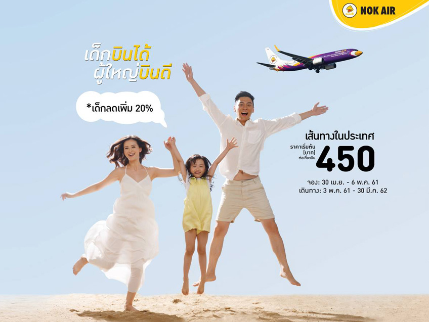 “เด็กบินได้ ผู้ใหญ่บินดี” ให้คุณได้จองตั๋วเครื่องบินราคาประหยัดกันทั้งครอบครัว เส้นทางในประเทศราคาเริ่มต้นเพียง 450 บาท และเส้นทางต่างประเทศ ราคาเริ่มต้น 1,050 บาท เท่านั้น