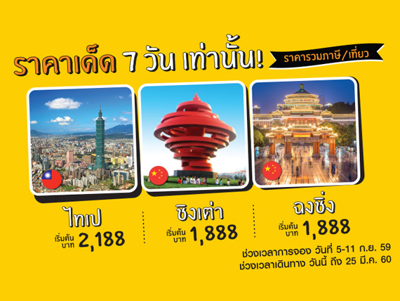 - ชั้นประหยัด (Fly) เส้นทางบิน : บินจาก กรุงเทพฯ ถึง ไทเป ในราคาเริ่มต้น 2,188 บาท