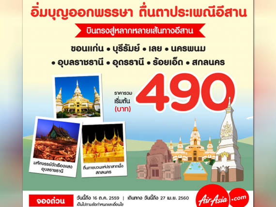 และในวันนี้ govivigo มีโปรโมชั่นใหม่เอาใจสายบุญ จากสายการบิน AirAsia "อิ่มบุญออกพรรษา ตื่นตาประเพณีอีสาน กับราคาตั๋ว AirAsia เพียง 490 บาท"ในเส้นทางการบินในประเทศ ได้แก่ ขอนแก่น, บุรีรัมย์, เลย, นครพนม, อุบลราชธานี, อุดรธานี, ร้อยเอ็ด และสกลนคร ในราคาเริ่มต้นเพียง 490 บาทเท่านั้น ไปท่องเที่ยวสัมผัสกับวัฒนธรรม ประเพณีอันงดงาม แถมอิ่มบุญ อิ่มอกอิ่มใจอีกด้วย
