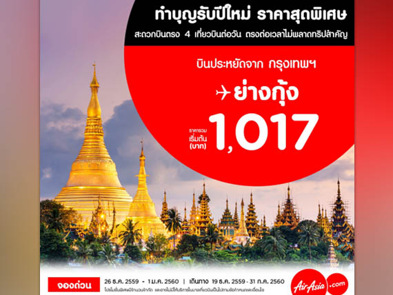 สำหรับใครที่อยากเดินสายทำบุญต่างแดน govivigo มีโปรโมชั่นใหม่จากสายการบิน AirAsia "ทำบุญเสริมดวงรับปีใหม่ที่ย่างกุ้ง บินไปกับ AirAsia ราคา 1,017 บาท" ในเส้นทางการบินต่างประเทศ จากกรุงเทพฯ สู่ ย่างกุ้ง ในราคาเริ่มต้น 1,017 บาท/ท่าน/เที่ยว (บินตรง 4 เที่ยว/วัน) เดินสายไหว้พระ ทำบุญ ต้อนรับปีใหม่ 2017 ที่จะมีแต่สิ่งดีดีเข้ามาในชีวิตนะคะ