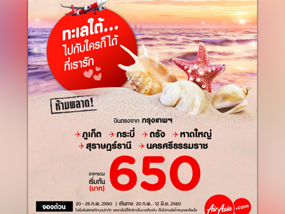 แต่ถ้าจะให้ฟินกว่านี้ govivigo มีโปรโมชั่นใหม่จากสายการบิน AirAsia "ล่องใต้เที่ยวทะเล กับราคาตั๋ว AirAsia สุดฟิน เริ่ม 650 บาท" ในเส้นทางการบินในประเทศ จากกรุงเทพฯ สู่ ภูเก็ต, กระบี่, ตรัง, หาดใหญ่, สุราษฎร์ธานี และนครศรีธรรมราช ราคาเริ่มต้นเพียง 650 บาทเท่านั้น ราคาถูกสุดคุ้ม รีบจองวนไปคะ