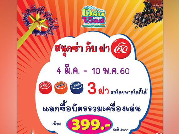 วันนี้ govivigo มีโปรโมชั่นใหม่จาก DreamWorld ต้อนรับช่วงปิดเทอม กับโปร "DreamWorld สนุกซ่า กับฝาโค้ก 3 ฝา รับทันทีบัตรรวมเครื่องเล่น 399 บาท" เพียงแค่นำฝาโค้ก 3 ฝา ขนาดใดและรสใดก็ได้ มาแลกซื้อบัตรรวมเครื่องเล่น เพียง 399 บาท (ปกติ 500 บาท) บัตรนี้สามารถเล่นได้อย่างละรอบเท่านั้นคะ เพื่อน ๆ สามารถไปรวมสนุกได้ตั้งแต่วันนี้เป็นต้นไปเลยจ้า