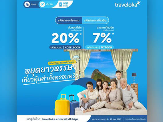 สายเที่ยวห้ามพลาด ไม่ว่าคุณชอบเที่ยวแบบไหน ไม่ว่าจะสายหรู สายลุย สายชิลล์ โปรเดียวเอาอยู่ "Traveloka เอาใจสายเที่ยวในประเทศ กับส่วนลดโรงแรม 20% ตั๋วลดเพิ่มอีก 7%" เอาใจสายเที่ยวในประเทศด้วยโปรสุดคุ้มกับรหัสส่วนลด โรงแรม และ ตั๋วเครื่องบินภายในประเทศ มาเป็นครบๆ แบบที่ว่ามีทั้งตั๋ว ต่อจองโรงแรม