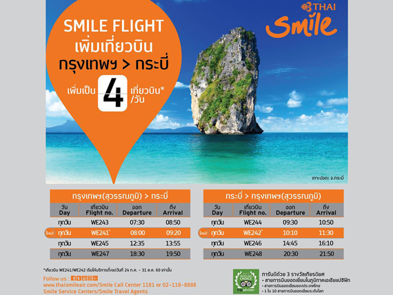 ใครที่มีแพลนพาคุณแม่และครอบครัวไปเที่ยวพักผ่อนที่ทะเลใต้ "กระบี่" สายการบิน ThaiSmile เพิ่มเที่ยวบินไปลั้ลลาเที่ยวกระบี่ วันละ 4 เที่ยวต่อวัน ไทยสมายล์เติมรอยยิ้มให้ผู้โดยสาร เพิ่มความสะดวกด้วยเที่ยวบินจาก กรุงเทพฯ (สุวรรณภูมิ) – กระบี่ 4 เที่ยวบินต่อวัน*