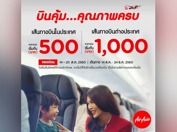 กับโปร "AirAsia บินคุ้ม คุณภาพครบ ในราคาตั๋วสุดฮอต เริ่มต้น 500 บาท" เส้นทางบินในประเทศ ราคารวมเริ่มต้น 500 บาท และ เส้นทางต่างประเทศ ราคารวมเริ่มต้น 1,000 บาท รีบจองนะค่ะ เพราะโปรโมชั่นพิเศษมีจำนวนจำกัด