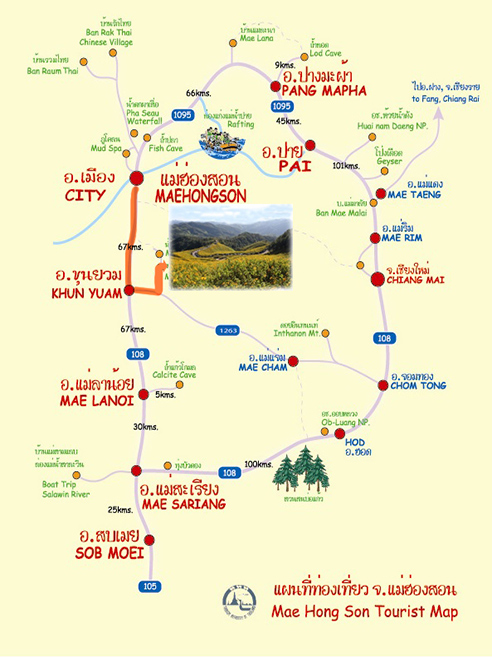 ใช้ทางหลวงหมายเลข 108 สายแม่ฮ่องสอน-ขุนยวม ก่อนจะถึงตัวอำเภอ ระยะทางประมาณ 1 กิโลเมตร แล้วเลี้ยวซ้ายตามทางหลวงหมายเลข 1263 ระยะทางประมาณ 26 กิโลเมตร ก็จะเข้าสู่ทุ่งบัวตอง ซึ่งเป็นถนนลาดยาง