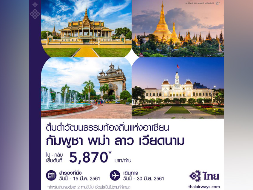 วันนี้ govivigo มีโปรโมชั่นใหม่จากสายการบิน Thai Airways มาฝาก กับโปร "INDOCHINA AND MYANMAR TOGETHER" บินเที่ยว กัมพูชา พม่า ลาว เวียดนาม พร้อมบริการแบบฟลูเซอร์วิสในราคาตั๋วเครื่องบินสุดพิเศษ ไป-กลับ เริ่มต้นที่ 5870* บาท / ท่าน