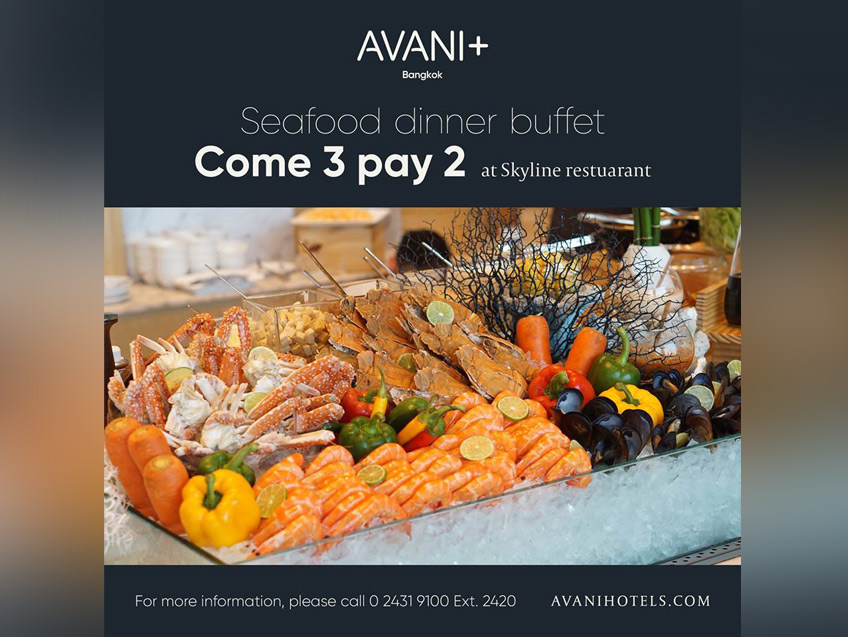 ห้องอาหารสกายไลน์ โรงแรมอวานี พลัส ริเวอร์ไซด์ ขอเชิญทุกท่านอิ่มอร่อยแบบจัดเต็มยกแก๊งด้วยโปรโมชั่นสุดคุ้ม “มา 3 จ่าย 2” กับซีฟู้ดบุฟเฟต์ระดับพรีเมี่ยม ที่คัดสรรจากทั่วทุกมุมโลกมาให้คุณได้เลือกลิ้มลองกันอย่างจุใจ ไม่ว่าจะเป็น ปูม้า กั้ง หอยแมลงภู่ 4 สายพันธุ์ กุ้งแม่น้ำ ปลา รวมถึงอาหารทะเลย่างและเนื้อย่าง ชิซาซิมิ ที่สั่งทำกันสดๆ ใหม่ๆ อีกทั้งยังมีเมนูอาหารอื่นๆ ให้ท่านได้เลือกสรร รวมถึงเมนูขนมหวานกับเค้กนานาชนิด ไอศกรีมหลากรส ผลไม้ตามฤดูกาล และอื่นๆ อีกมากมาย พร้อมชมวิวแม่น้ำเจ้าพระยาและวิวเมือง ด้วยบรรยากาศแสนผ่อนคลาย