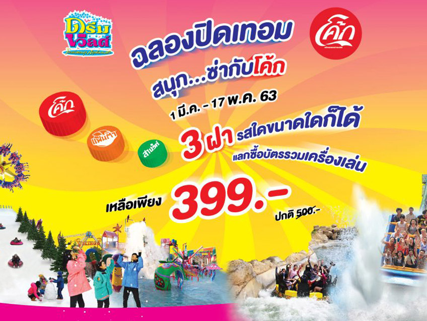 “สนุกซ่า..กับโค้ก” เพียงนำฝา โค้ก สไปรท์ แฟนต้า รสใด หรือขนาดใดก็ได้ 3 ฝา มาแลกซื้อบัตรรวมเครื่องเล่นเหลือเพียง 399 บาท จากปกติ 500 บาท สนุกยกครอบครัวกับเครื่องเล่นและความสนุกมากมายกว่า 26 รายการ ที่รองรับความสนุกทุกช่วงวัย อาทิ ทอร์นาโด สกายโคสเตอร์ เฮอริเคน ซูปเปอร์ สแปลช แกรนด์แคนยอน วอเตอร์ฟันสวนน้ำสำหรับเด็กๆ เปียก เย็น เล่นสนุก หรือจะนั่งชมวิวรอบดรีมเวิลด์ด้วย เคเบิ้ลคาร์ รถไฟดรีมเวิลด์ ก็สนุกสุดฟิน ปิดท้ายด้วย สไลเดอร์สุดสนุกใน “เมืองหิมะ” ร่าเริงกับหิมะตกตลอดทั้งวัน