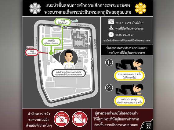 ทั้งนี้ การเข้าไปถวายสักการะพระบรมศพพระบาทสมเด็จพระปรมินทรมหาภูมิพลอดุลยเดช ทางสำนักพระราชวังขอความร่วมมือห้ามประชาชนบันทึกภาพใดๆ ทั้งสิ้น
