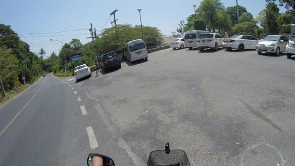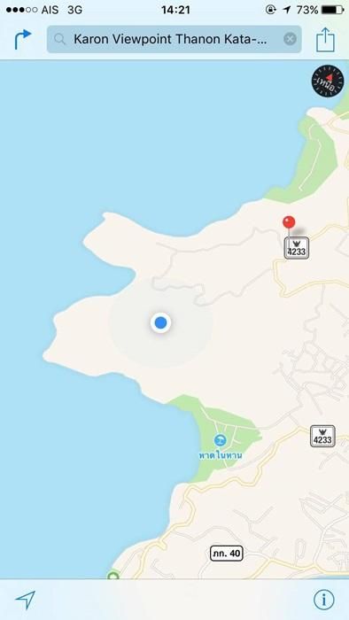 จุดสีแดงคือกะรนวิวพอยน์ สีฟ้า ผาหินดำ, ตอนแรกผมนึกว่าทางขึ้นอยู่แถวๆ หาดในหาน ขับรถไปวนๆ แถวนั้นก็หาทางขึ้นไม่เจอ เปิดเครื่องดูข้อมูลในพันทิปเค้าบอกว่าอยู่แถวกะรนวิวพอยแต่ผมไม่เห็นมีซอยบอกไว้ว่าเข้าซอยไหนก็เลยมา งง อยู่แถวจุดชมวิวกะรนอยู่สักพัก ฮาๆ เลยวัดดวงขับเข้าซอยหาดูเลย55 เข้าเรื่องเลยเรามาเริ่มจากจุดชมวิวกะรน (Karon View Point) ขับลงไปแปปนึงถ้าดูในแผนที่แรกจะอยู่ซอยที่ 2 ให้สังเกตป้ายเขียนว่า ถนนแหลมมุมนอก ซอยจะอยู่ทางขวามือ เลี้ยวเข้าไปได้เลย