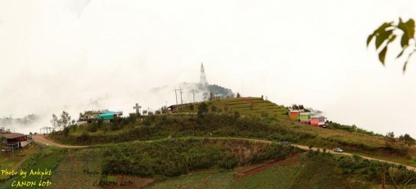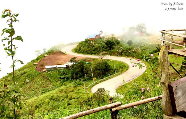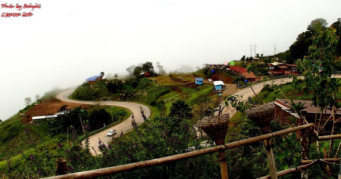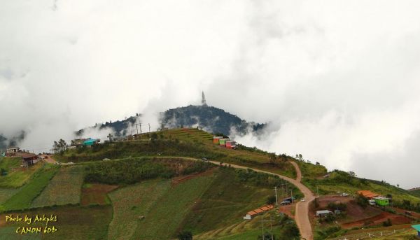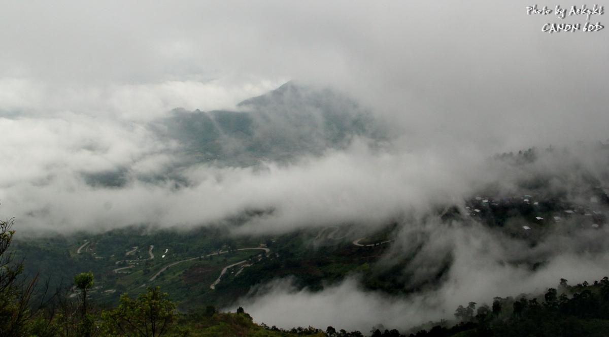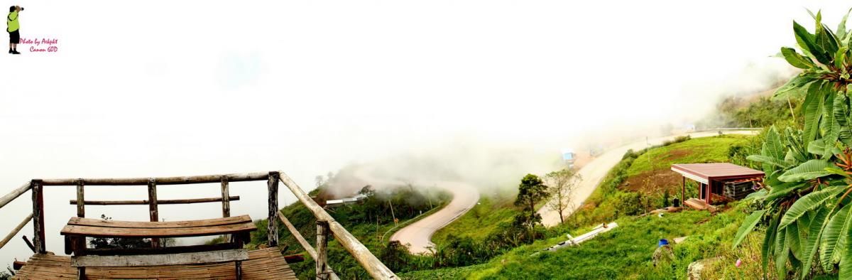 เริ่มเลย จากจดชมวิวช่วงเลเขาค้อไปนิด จะมองไปด้านหลังซ้ายมือ เพื่อจะมองวัดผาซ่อนแก้ว มองไม่เห็นหมอกบังมิดเลย