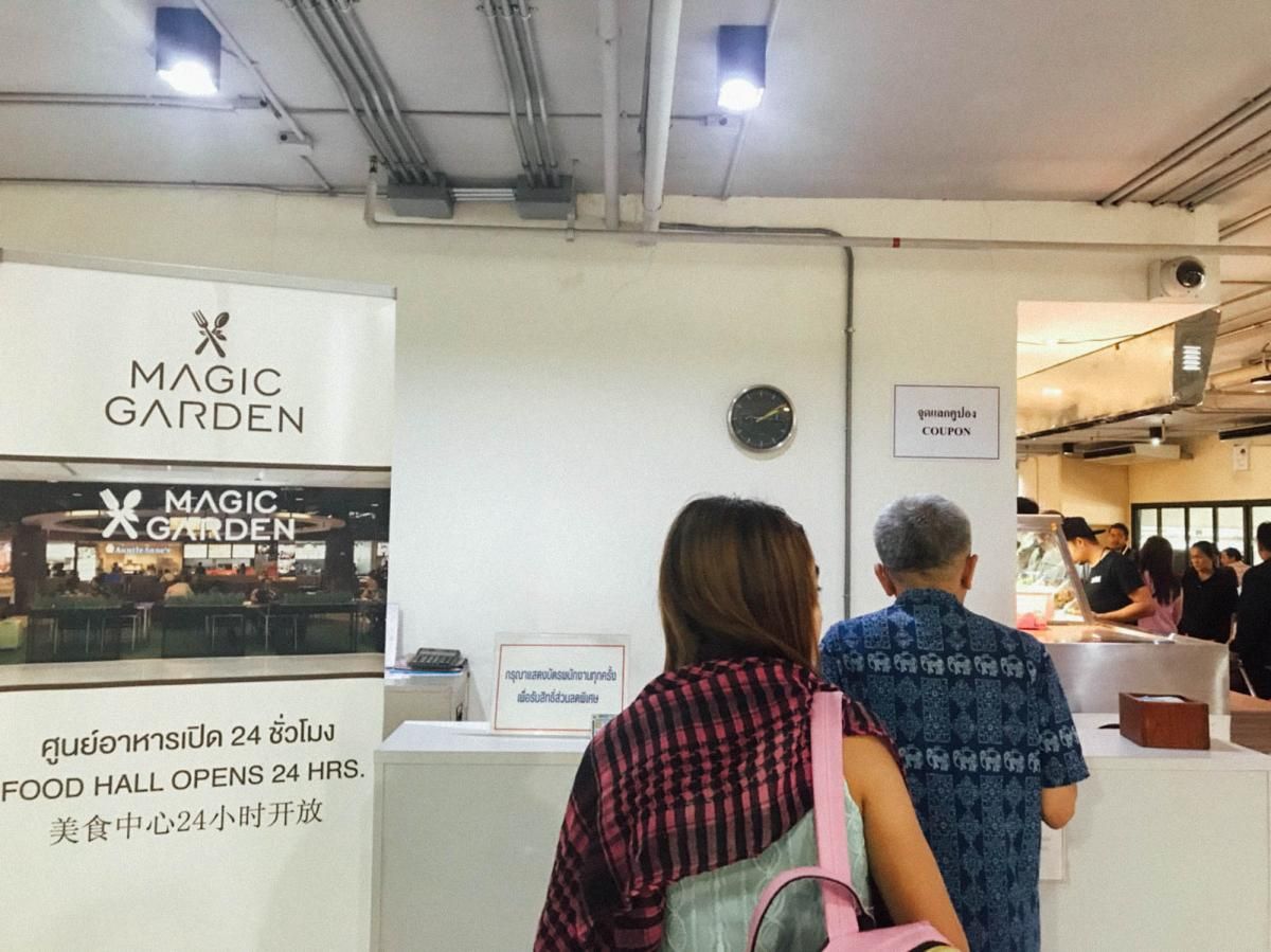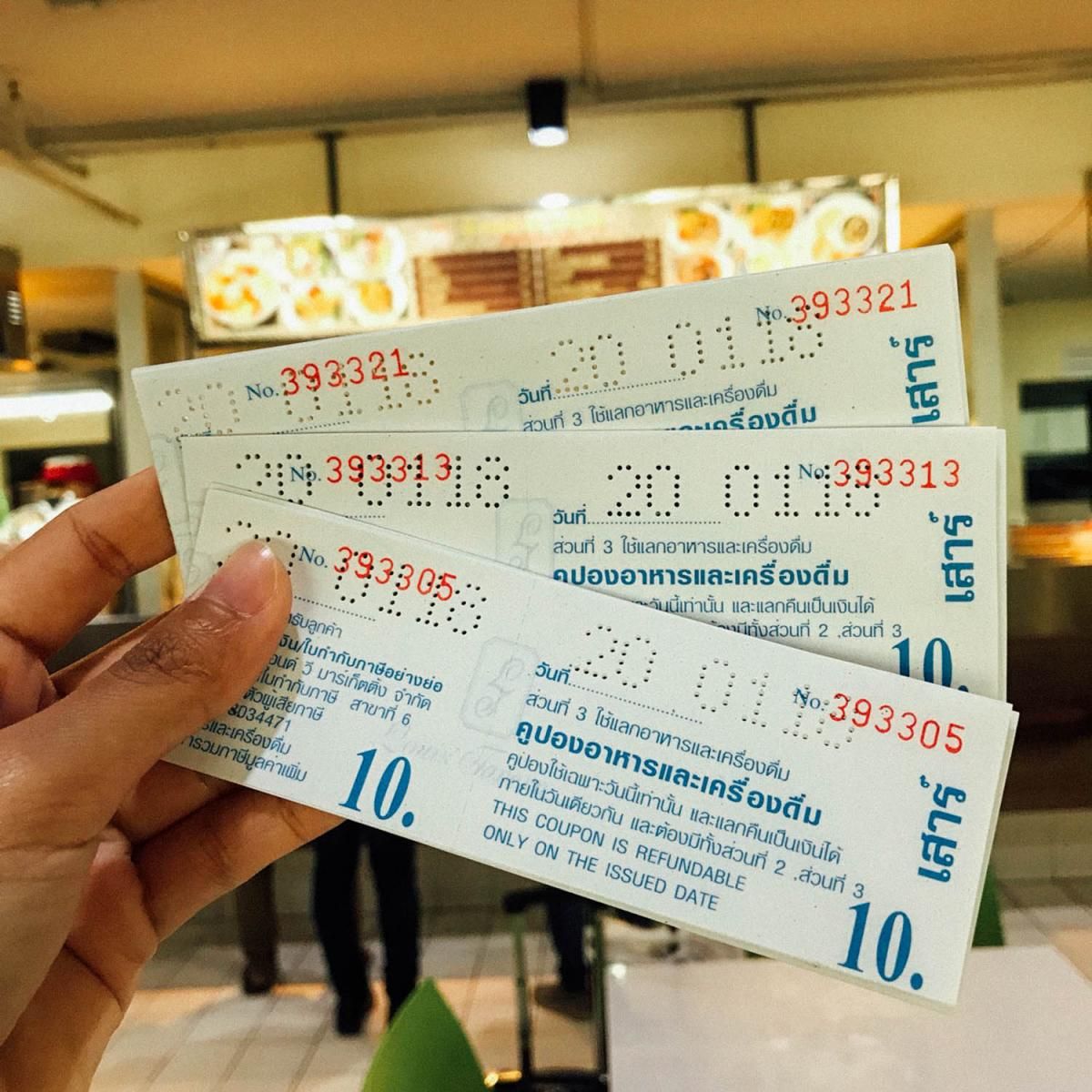 ก่อนจะซื้ออาหารต้องแลกคูปองก่อน ที่นี่เป็นคูปองกระดาษฉีกแบบนี้เลย ครั้งนี้เราตั้งงบไว้ 300 บาท มาดูกันว่าจะทานอะไรได้บ้างในงบเท่านี้