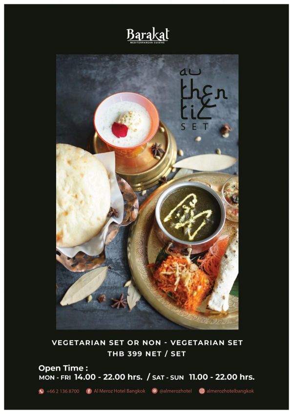 โรงแรมอัล มีรอซ (Al Meroz) แนะนำเซ็ทเมนูอาหารสุดคุ้ม “อาราเบียนรสเลิศ” ที่นำศิลปะการปรุงอาหารตะวันออกกลางผสานเมดิเตอร์เรเนียนแนวใหม่ ที่มอบรสชาติกลมกล่อม กลิ่นละมุนและดีไซน์เก๋ ราคาเพียงเซ็ทละ 399 บาท มีให้เลือก 2 เซ็ทสุดคุ้มที่ทานได้สูงสุดถึง 7 จาน เสิร์ฟทุกวัน ที่ห้องอาหารบารากัต ชั้น 2 โรงแรมอัล มีรอซ ถนนรามคำแหงซอย 5 สำรองที่นั่ง โทร 02-136-8700 ต่อ 4305 http://www.facebook.com/almeroz.bangkok/