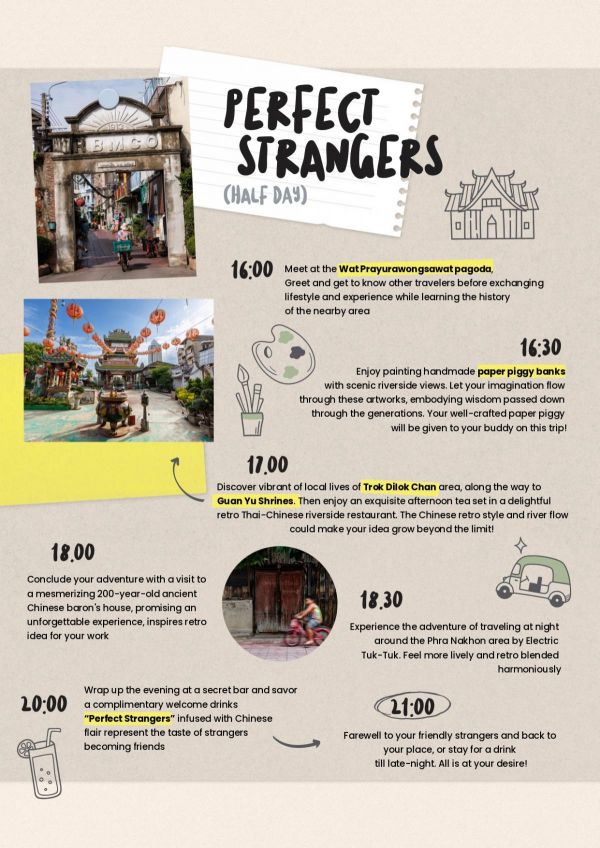 17.00: Discover vibrant of local lives of Trok Dilok Chan area, along the way to Guan Yu Shrines. Then enjoy an exquisite afternoon tea set in a delightful retro Thai-Chinese riverside restaurant. The Chinese retro style and river flow could make your idea grow beyond the limit!