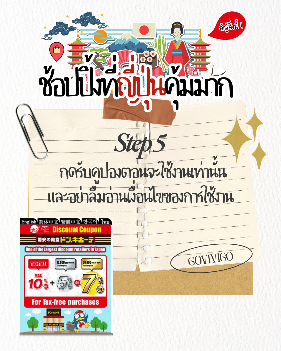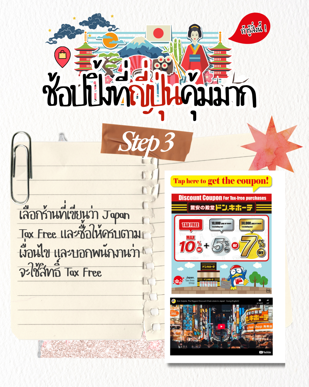 - Don Quijote: สามารถใช้ Tax Free 10% + คูปองเพิ่มสูงสุด 7%